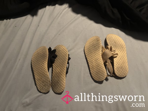 Worn and dirty, flat sandals, size 6 Ships and discrete mailer with tracking...