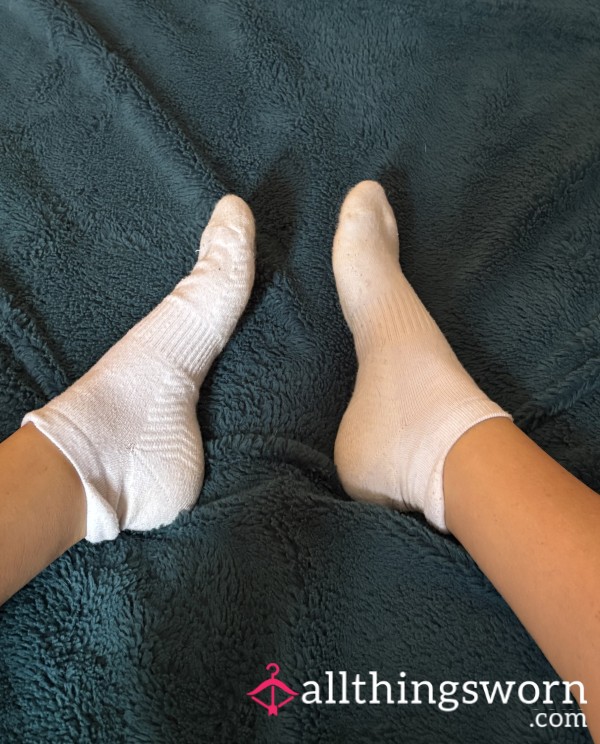 These are a pair of well worn thick white, pink and grey socks which have been washed and...