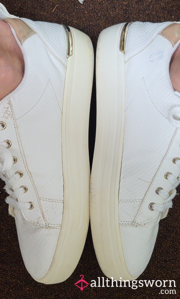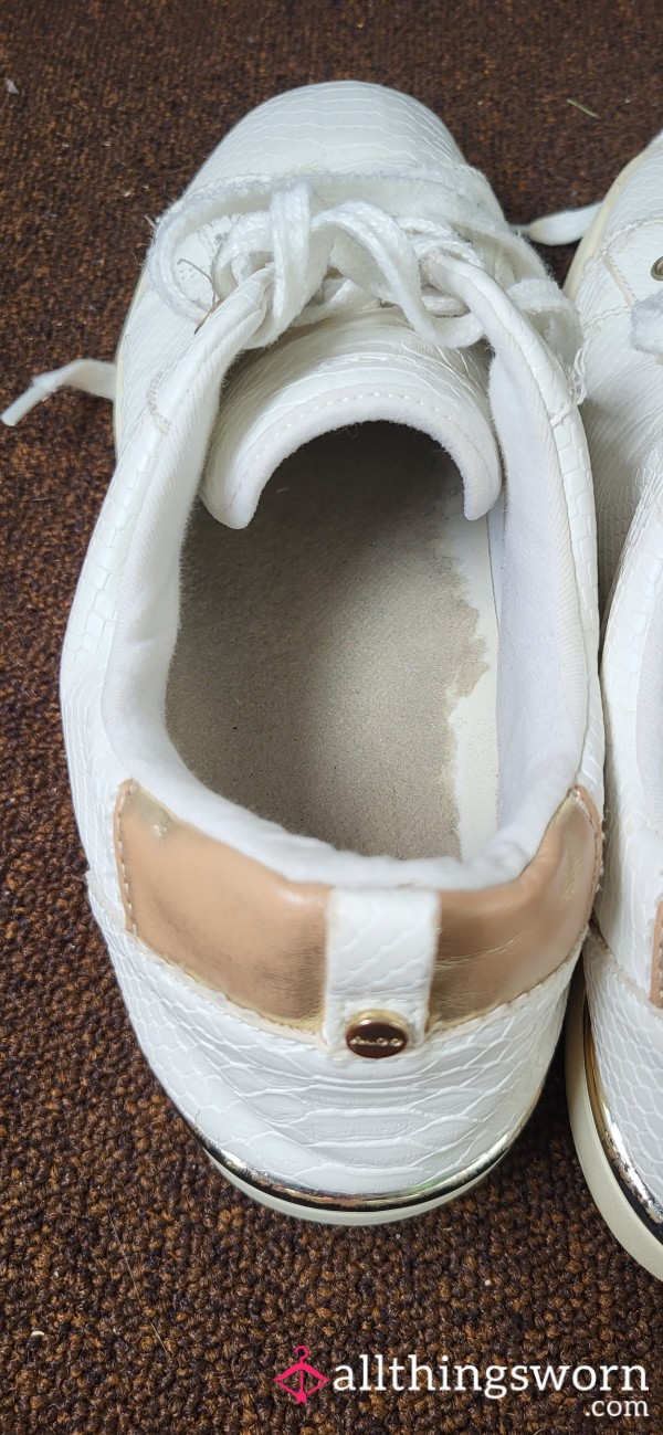 Trashed grey and white trainers. Well worn, stained, smelly and broken sole...