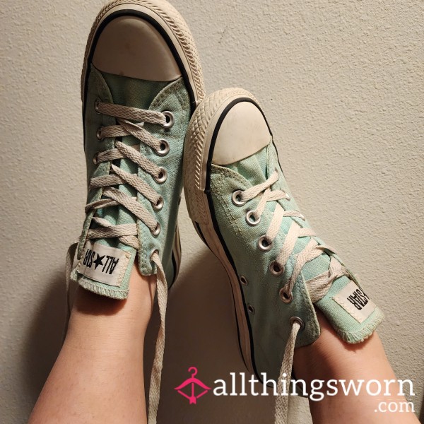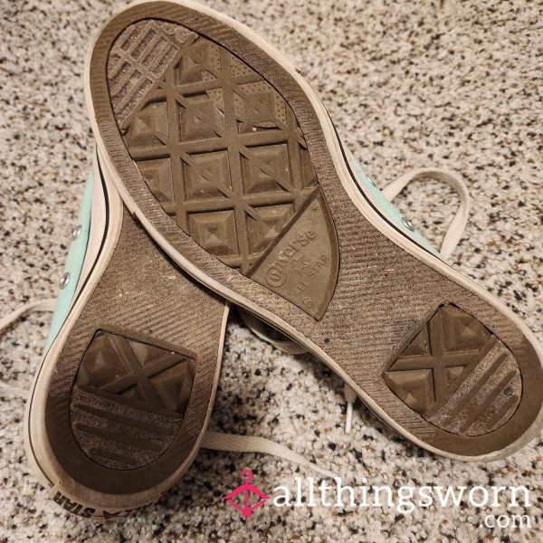 Well worn, dirty leather hi top converse. Uk size 5.5. Very dirty soles, used for 3 years.