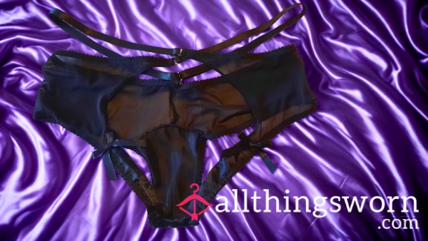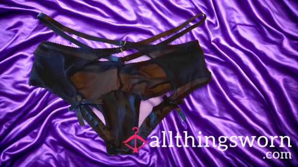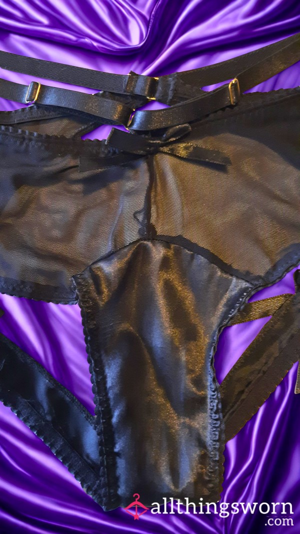 These Goddess worn black mesh panties are crotch-less with suspender straps and a tauntingly teasing rearview. The gusset is black satin for that extra Superiority! Worn by Goddess for 24 hours before sending in an airtight bag to retain the scent & perfume of Mistress.