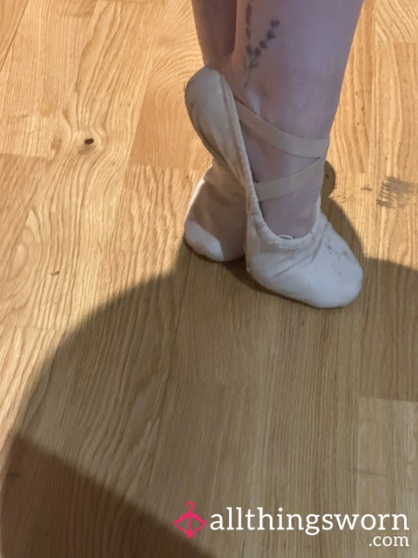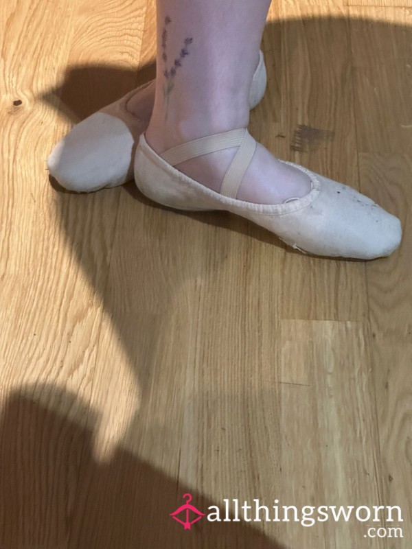 Small, split sole ballet shoes. Elastic is hand sewn by myself and the shoes have been worn for countless ballet lessons. Signs of wear from constant use.