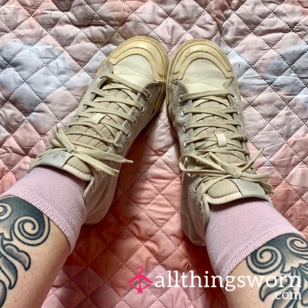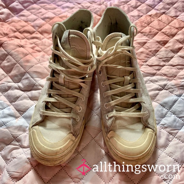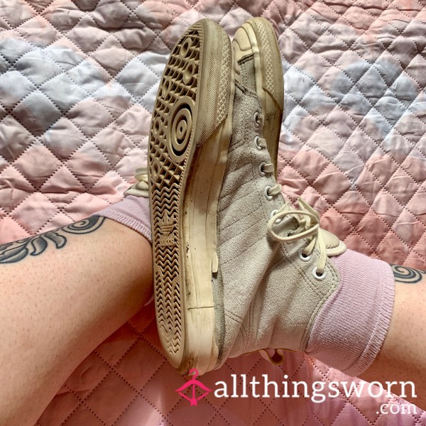 These Adidas Nizza high-tops have been put through their paces – canvas uppers scuffed, softened and stained from daily wear, rubber soles worn down and coming apart in places, laces tangled from constant use. They’re cla**ic white once upon a time, but now they carry that dirty, beaten-in look that only comes from being truly loved.