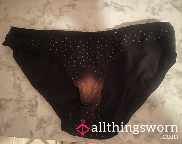 Black bikini panty with white polka dots. Very old, stretched out, and worn pair with a “bleached” spot on the pu**y area. Size XS but stretched.