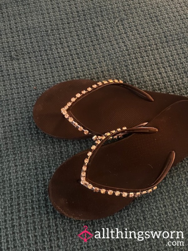 I have worn these flip-flops for over a year, and they are my go-to. They are very well worn, and they have my foot impression in them. They are black with rhinestones on the straps.