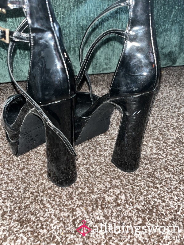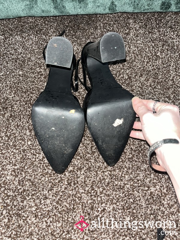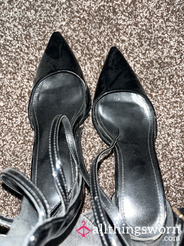 Dangerously high black leather sling backs with a p**p toe, black straps and gold buckles. Too high to...