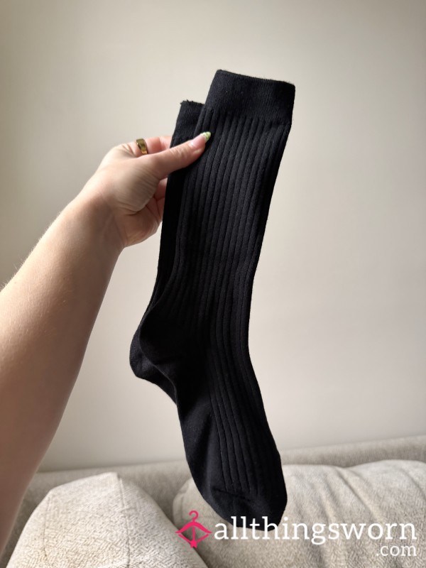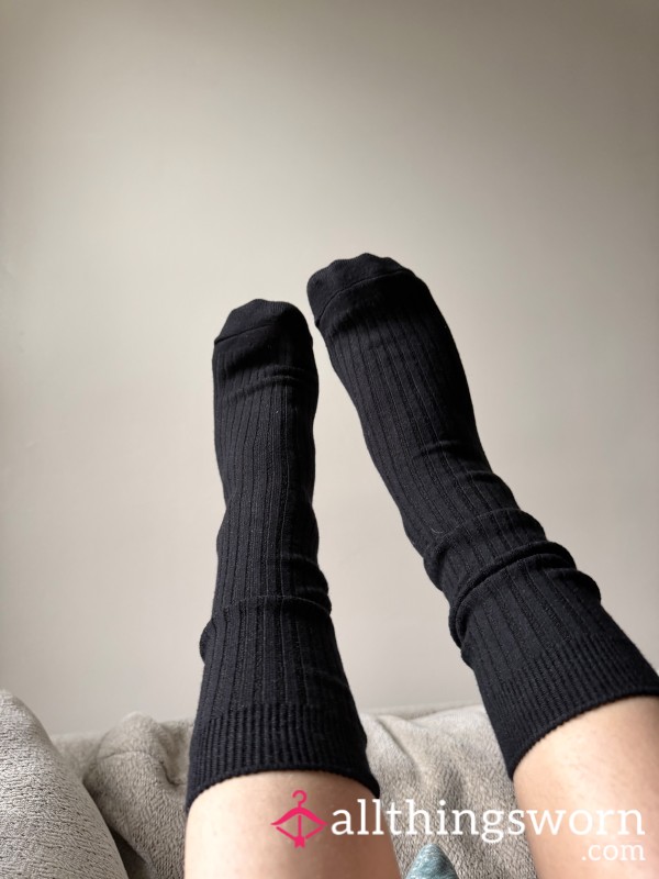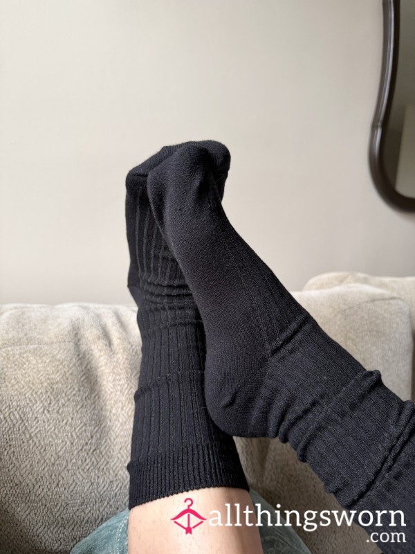 Old worn and stained white crew length socks. Well loved. Will include full days wear....