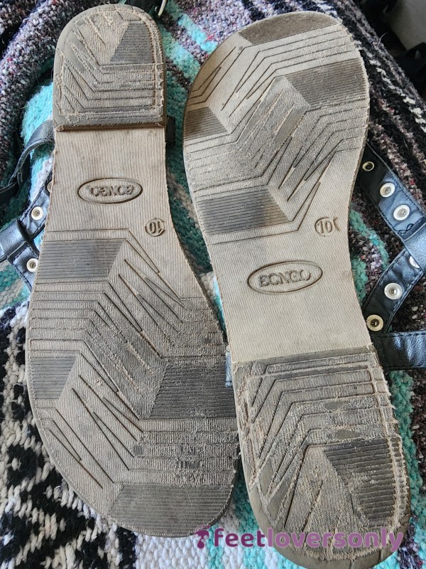 Rainbow slip-on open toe flats, worn and softened by plenty of outings. These shoes carry the playful energy...