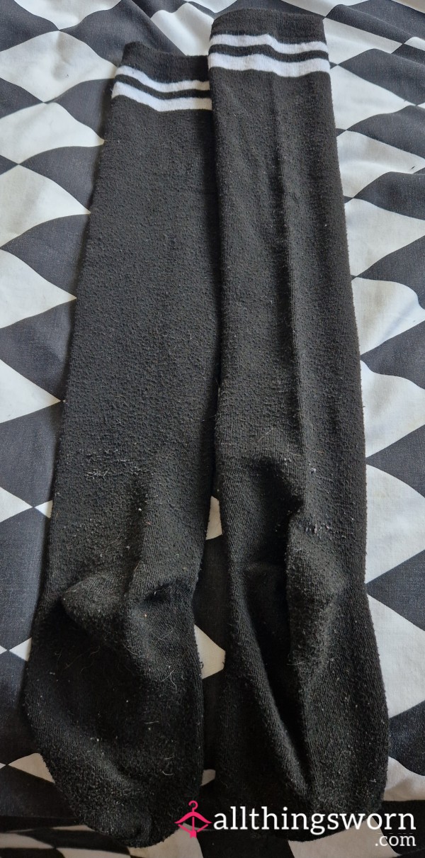 These black thigh-high socks with white stripes have clung to my legs like a second skin — soft, snug, and stretched just right. They’ve seen me lounging, teasing, and getting a little too hot to stay still.