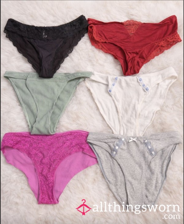 A bundle of my pre-loved panties, worn by me and full of my natural scent. Panty details: • Cotton lace – top 2 • Cotton – bottom 4 You’ll get pics of the wear, every angle and crease, showing exactly what these panties went through. 💦 Vacuum-sealed, discreet, tracked shipping 😈 Add-ons, extra scenting, and kinkier custom requests always welcome Warm, worn, dirty, and personal… exactly how you want them.