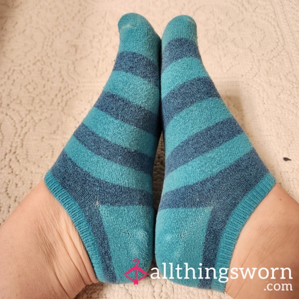 Used black trainer socks, unwashed. Worn throughout the work day....