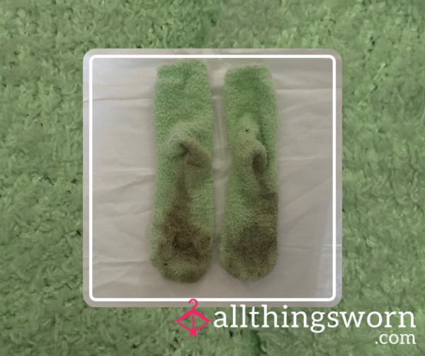 Soft mint fluff, innocent to the eye but filthy once you know where they’ve been. These socks wrapped around my feet for 24 hours, soaking up sweat, warmth, and scent until they became something far darker than cozy. Every step fed them with me, every shift staining the fibres with heat.