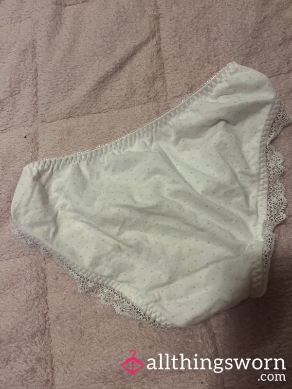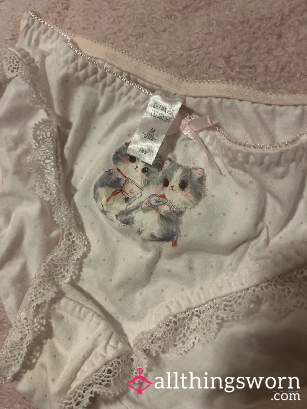 Cute cotton, kitty design panties. White with pink polka dots, Lace trim & ribbon detail on the front. π π± Size medium (more like a small) Price includes 24hour wear plus postage and packaging PLUS 3 photos of wear ππ±β₯οΈ Add ons are Β£5 each.