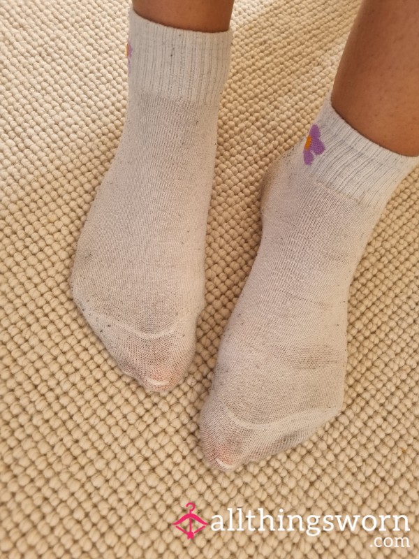 Cute blue and white cherry print trainer socks🍒Worn for 48 hours, vacuum sealed and packaged discreetly👀Add ons are...