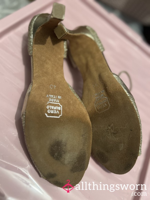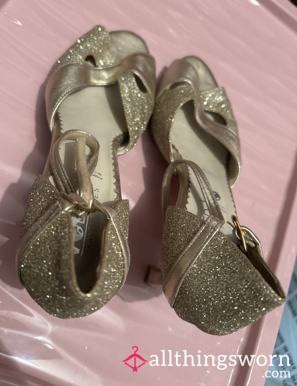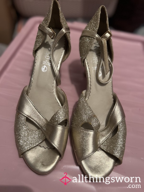 My beloved latin & ballroom dancing shoes, gold and with glitter, used for quite some time while going to bachata & salsa dance meets. 😊