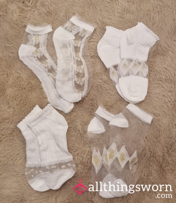 Elegant sheer socks with beautiful lace details and subtle gold accents 💫 Made from a soft, gentle, and stretchy material that feels light on the skin and looks super feminine 🌸 Perfect for adding a cute touch to any outfit 🧦💕 💸 Pricing: 1 pair for 5 All pairs for 15 In case of Extras, PM for more information! <3