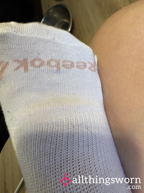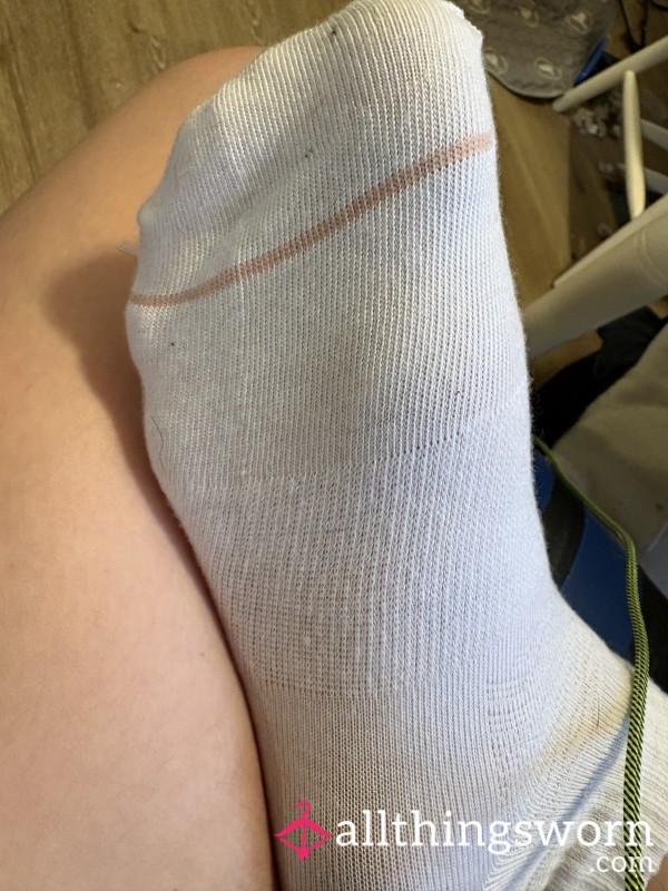 White trainer socks with "OUR DIRTY LITTLE SECRET" written on the underside of one sock with a fabric...