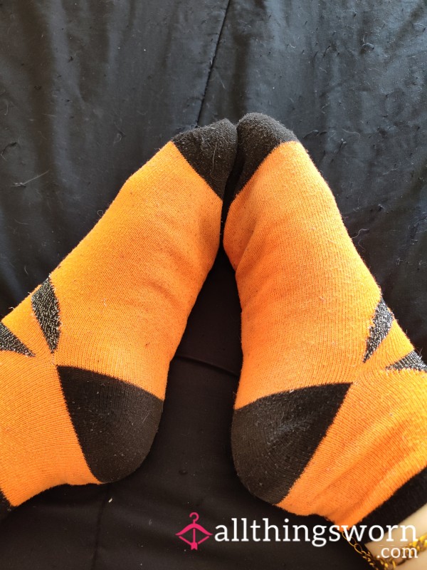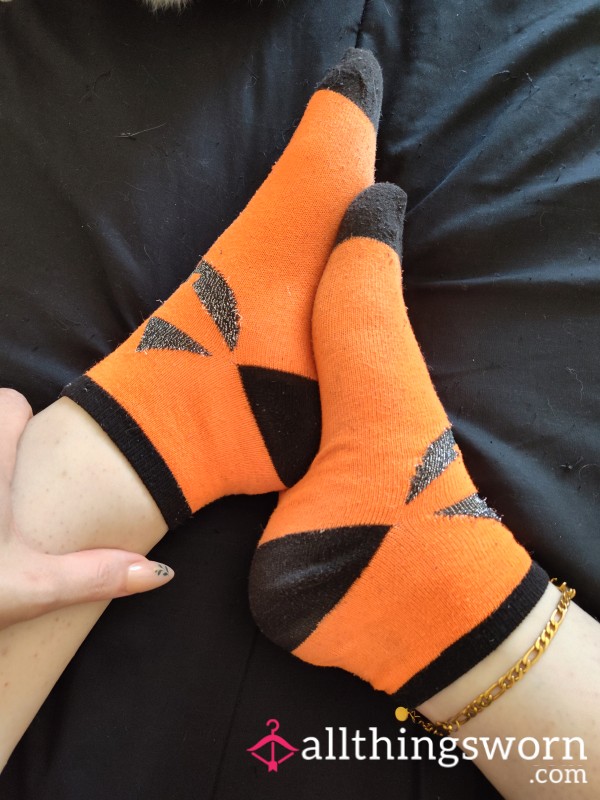 Happy Halloween! Get festive with these orange pumpkin ankle socks worn to your liking.