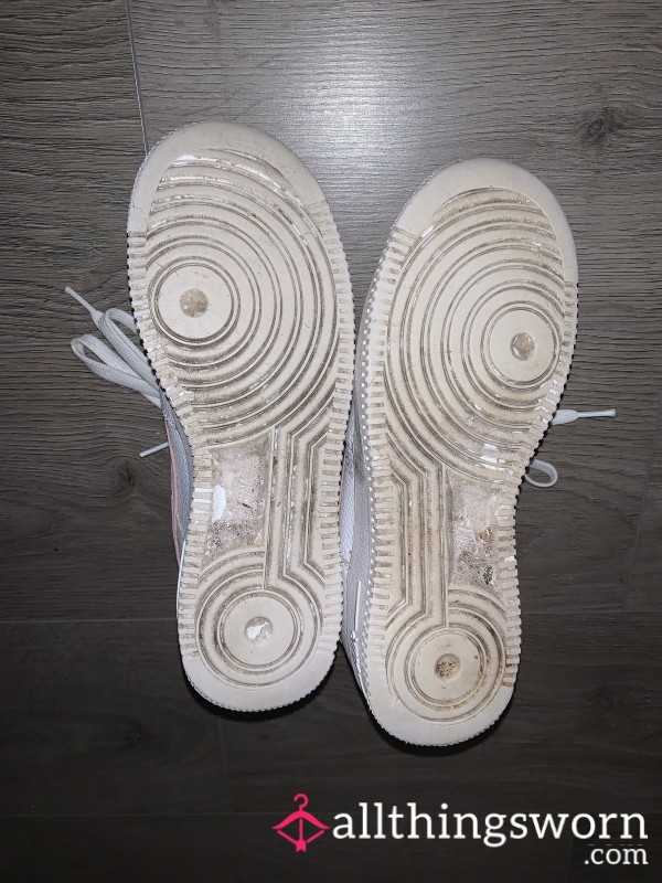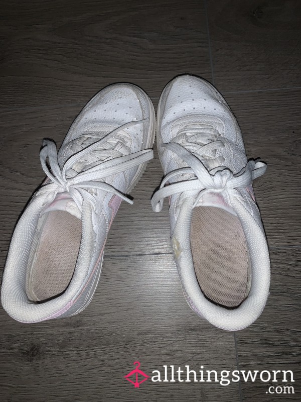 Well loved and worn white Vans.