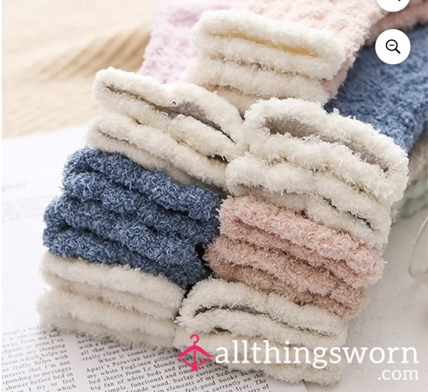 White fluffy socks with multiple colour stripes! I will wear them for 24H 2 pictures for proof of...