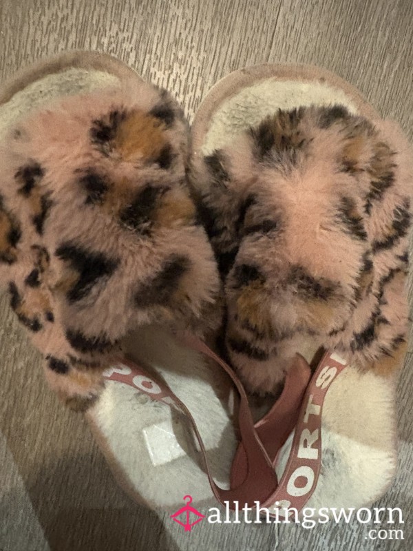 These cute and cozy leopard-print fluffies have been my go-to for lounging around. The inside carries the imprint of my feet and a lingering scent from hours of wear. The faux fur straps are super soft against bare skin, and the elastic heel band has stretched perfectly to my walk. Slightly worn soles with plenty of personality left in them. Perfect if you want something feminine, fluffy, and infused with my natural essence.