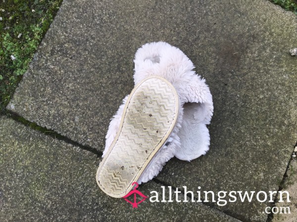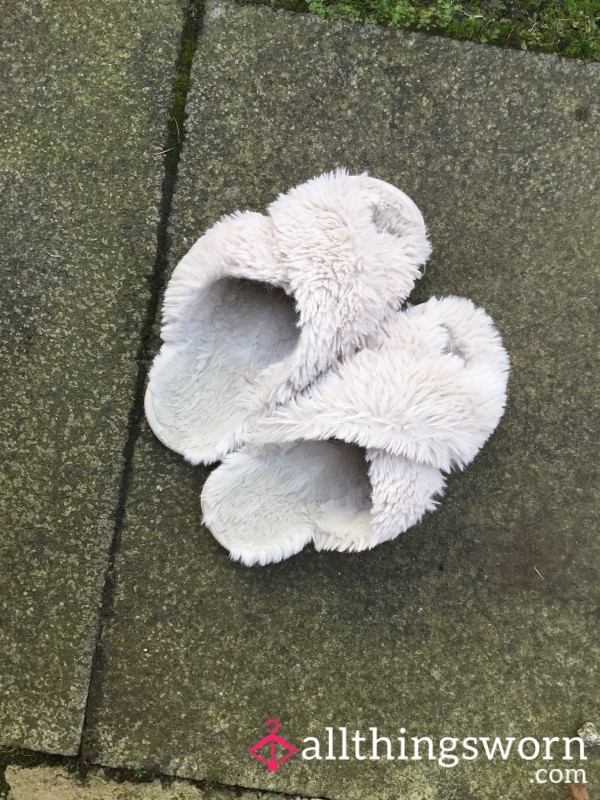 Well worn fluffy slippers, indoor and outdoor, always bare foot so as you can imagine a little stinky π happy to wear them more before sending Any questions or requests please feel free to message me π