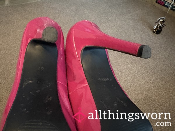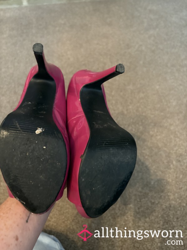 Very worn fuschia pink dolly shoes. Wear on the back heel from wearing them driving