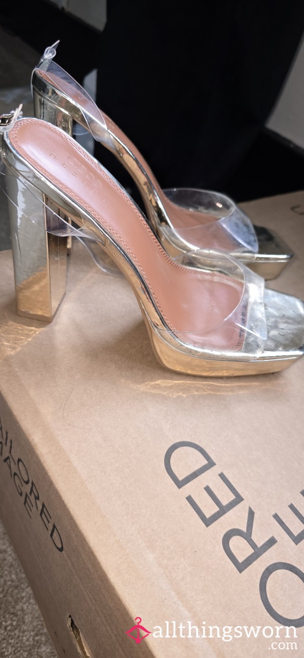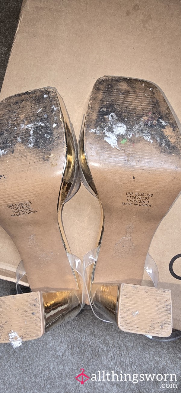 Gold heels with clear strap now up for grabs 👠✨ Well-worn and one of my favourite dancing pairs—they’ve had many naughty nights out 💋 Ready for their new home… who’s claiming them? 😘