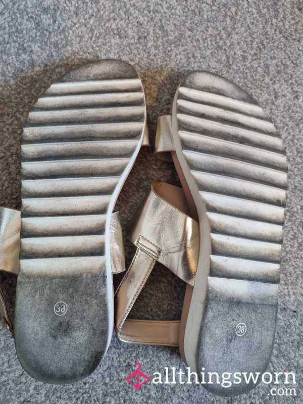 These gold sandals have seen plenty of wear and it shows. The once-shiny finish is now dulled and scuffed, with visible marks, creasing and general grime from repeated use. They’ve been worn out and about, on long days and warm nights, and have that unmistakable well-used look that only real wear can create.