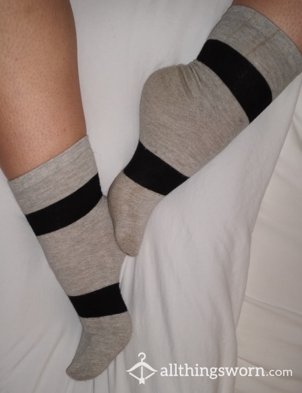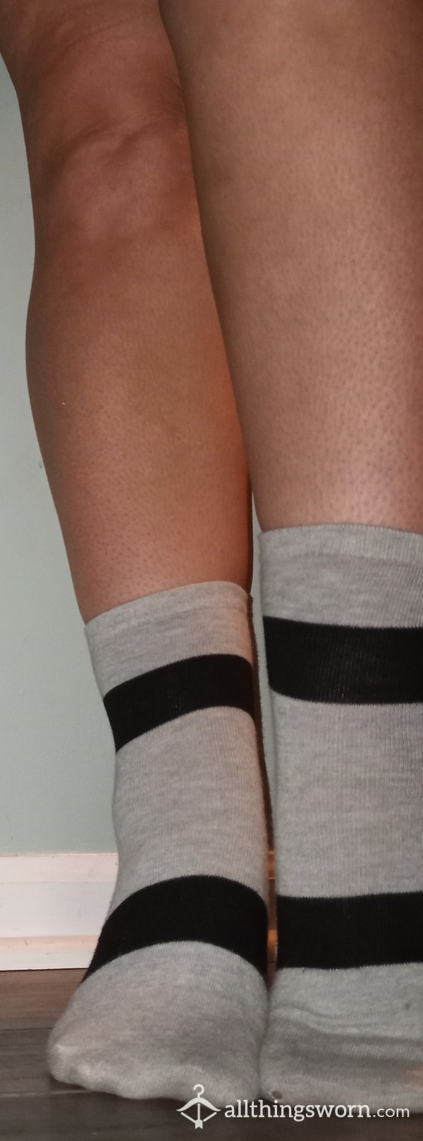 Gray with 2 black stripes. They're above the ankle socks, left sock has tiny hole from wearing them so much this fall & winter🖤