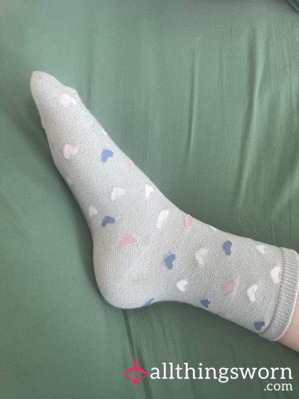 Well-Worn, Old White socks with beige heel and toes, thin on soles and close to being holes. 24...
