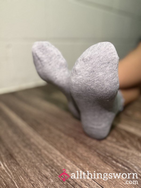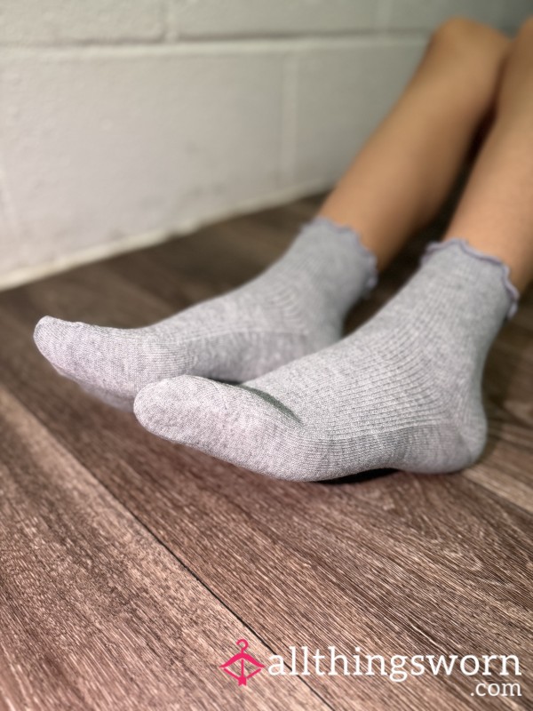 Old fuzzy socks with gray and blue stripes