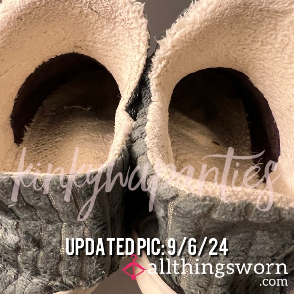 My go-to slippers for daily wear! These slippers are “high top” height, have a terry cloth, striped outside and a white fuzzy inside… increasingly matted down by my sweaty feet! The bottoms are fairly thin with a rubber bottom. Size 10 women’s!