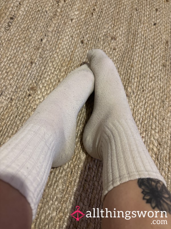 Dirty cream socks worn in the gym for over 2 hours of hot sweaty cardio, intense feet smell....