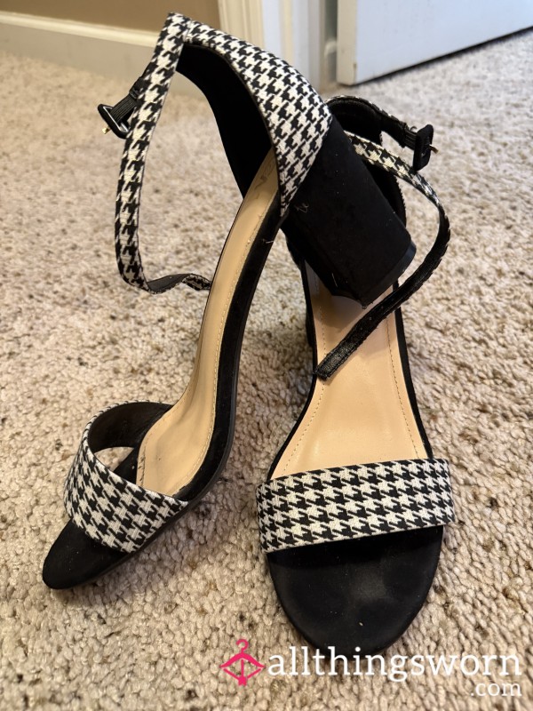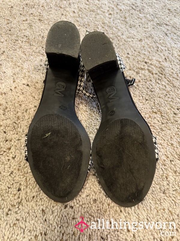 Houndstooth Pattern Black White Heels High Heels Chunk Heels Ankle Strap Dress Shoes Shoes Feet Toes Soles Worn Foot
