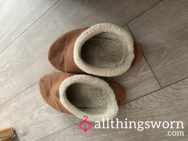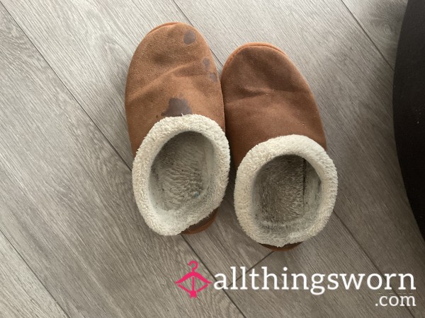 Well worn grey Ugg slippers. Worn with and without socks...