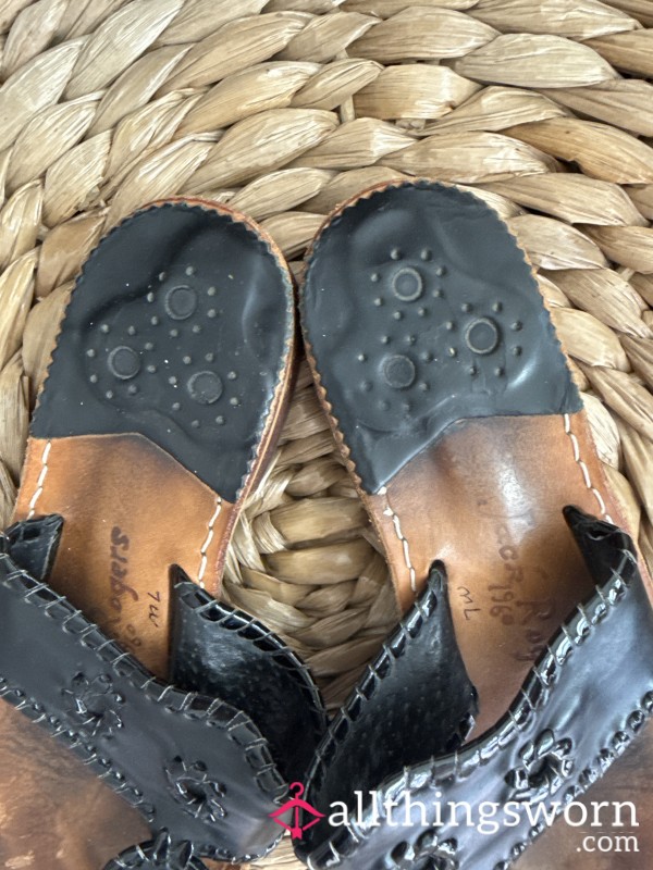 Well worn house shoes. Ive worn these for years after getting out of the shower, around my house...