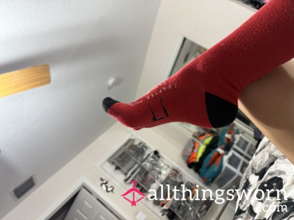 knee-high red and black Pennywise socks. They were very well-worn in Converse during an Amazon shift.