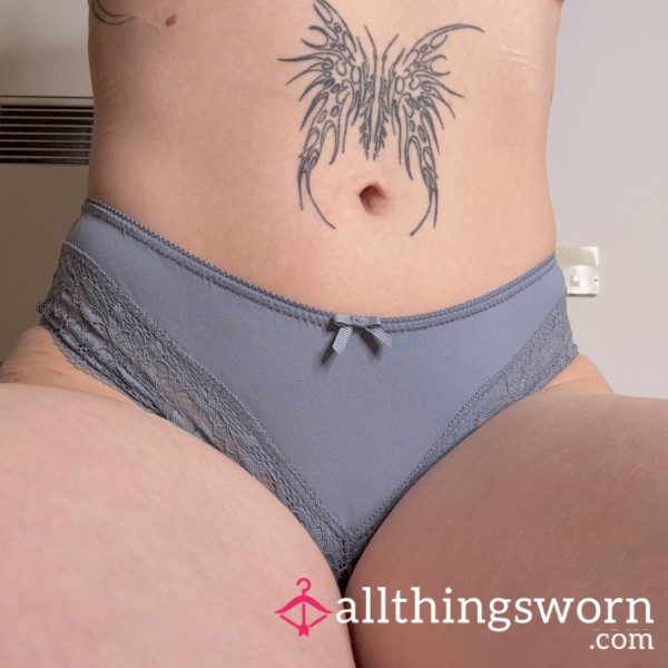 cheeky brazilian knickers with a cute blue bow on them. 24 hour wear and daily proof of wear pic included.