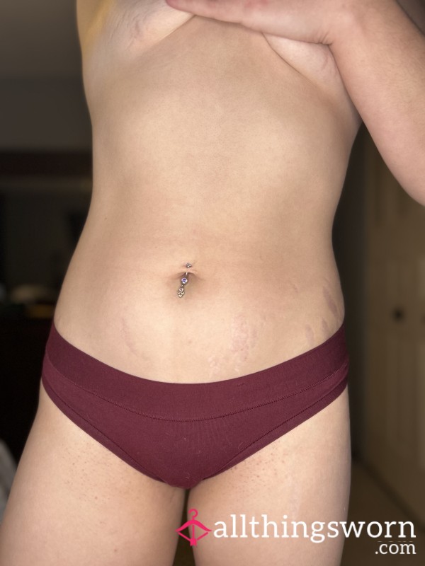 Maroon bikini panties worn for 24 hours or longer. Add ons always welcome!