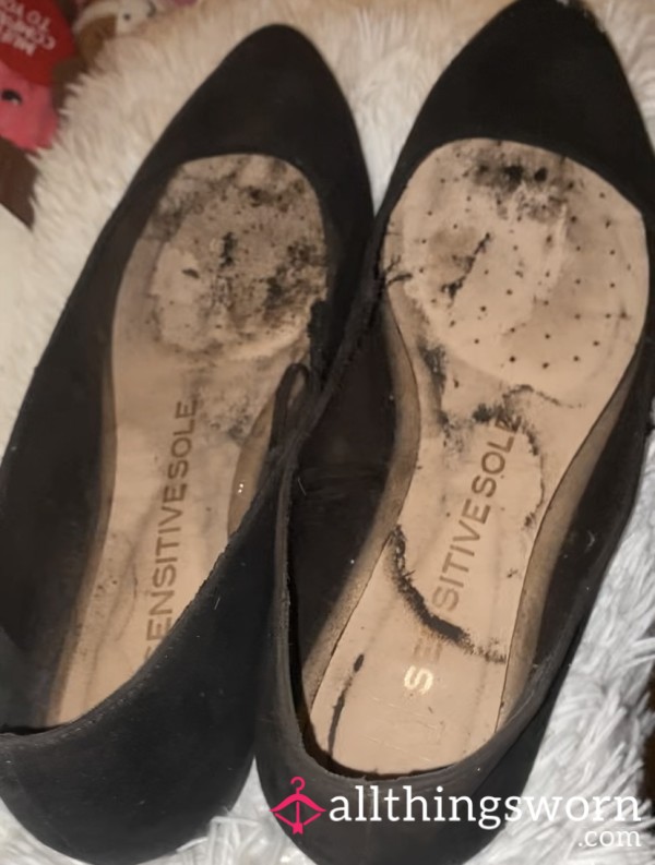 These are my really well worn Sweaty Flats😈 Extra sweat & dirt from the heatwave 🥵 Make my feet really sweaty n they smell really bad 😰 As you can see they are well loved 🥰