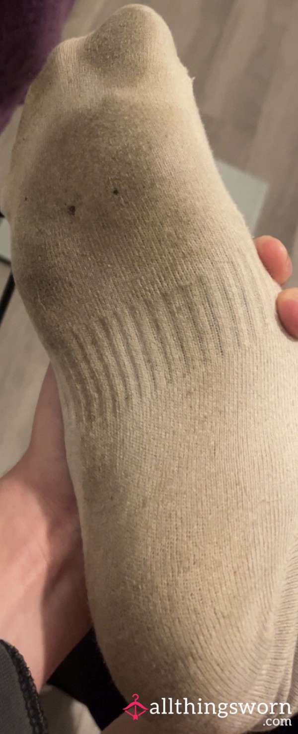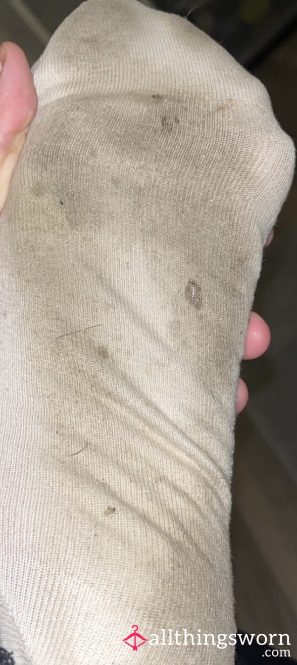 Odd white socks worn all day on my size 6 feet. Worn inside and outside of the house to make them extra filthy😉☺️