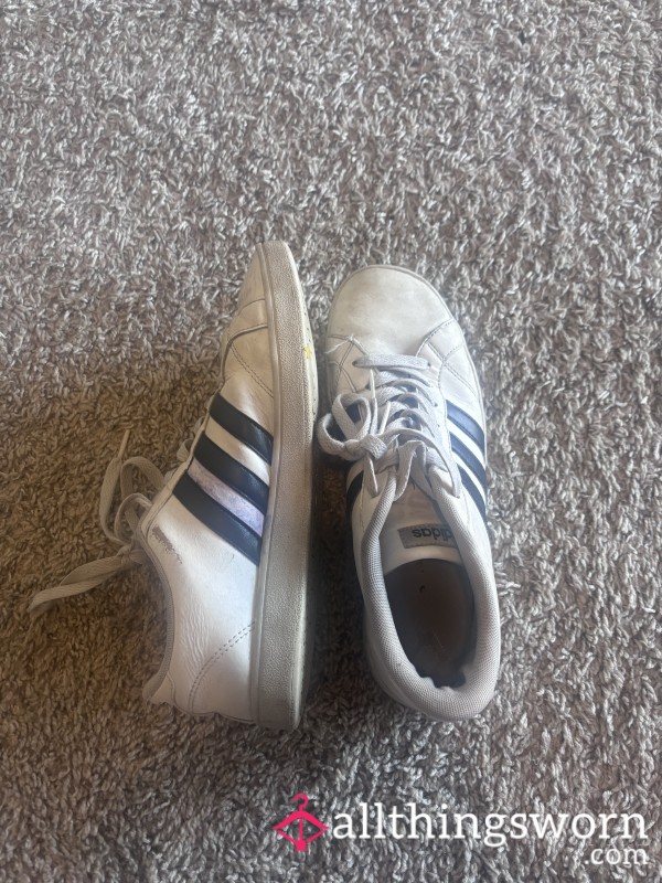 Very well worn white converse, size 10. Have had them for the past three years...