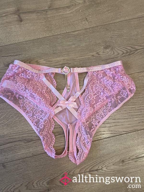 This is your chance to own my pink lace crotchless panties. They will be worn for 24 hours. If you would like me to wear them for longer, I can but there will be an extra charge.