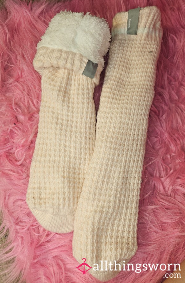 These are a pair of well worn thick white, pink and grey socks which have been washed and...