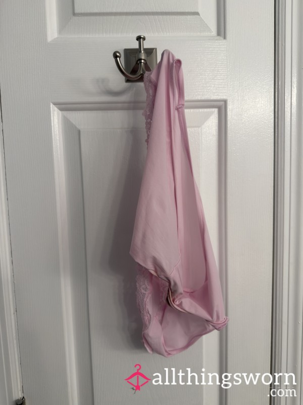 These are my pink panties with cute lace trim, worn for two full days of real, everyday life. Soft, feminine, and very obviously the real thing, no pretending, no staging.