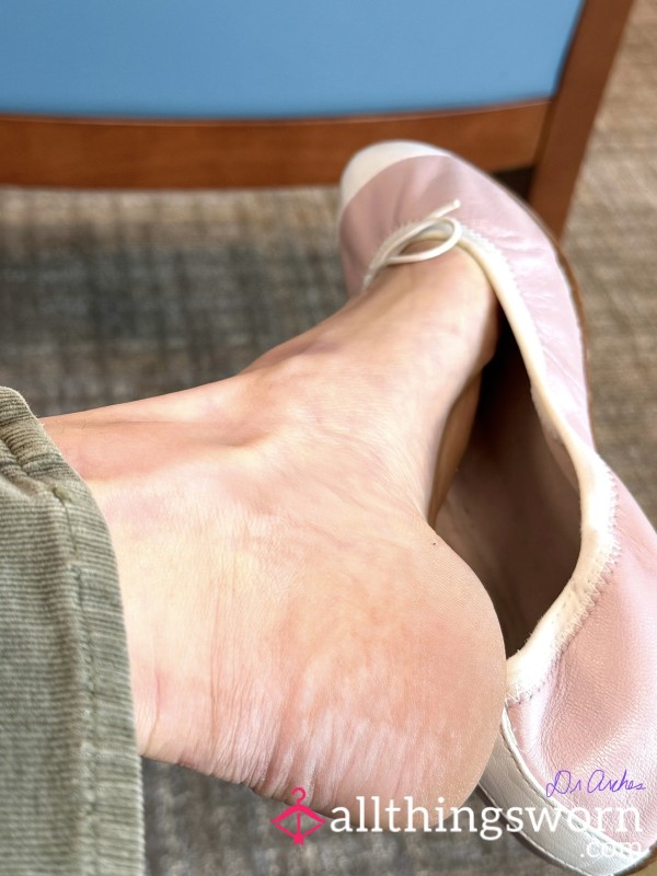 Ultra feminine pink and white ballet flats, leather-like material, quite worn and much loved. Tight fitting with an undeniable musky scent. Ready for a good forever home! Bloch brand, US size 8. These are for you if you crave that beloved flats odor!