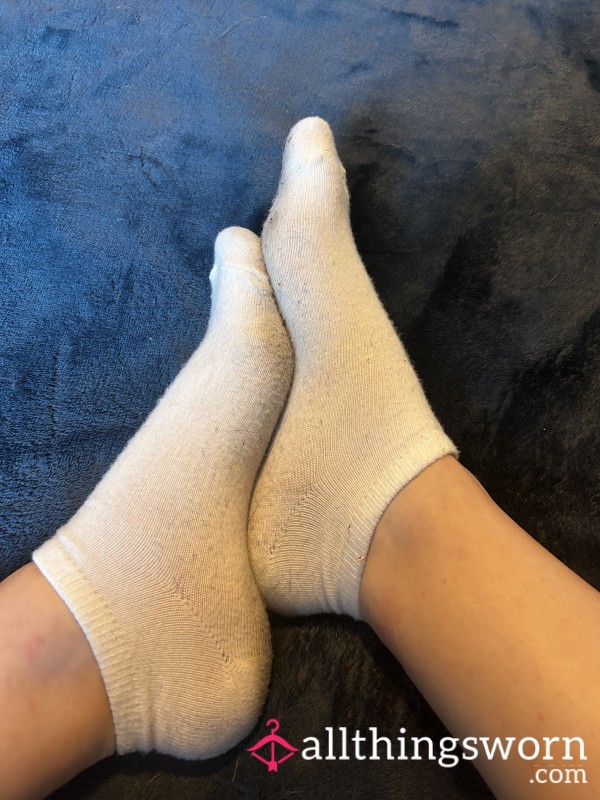 Plain white ankle socks worn for 48 hours or longer. Socks worn during my average day include walking in and out of shoes, one workout, and one long walk per day.
