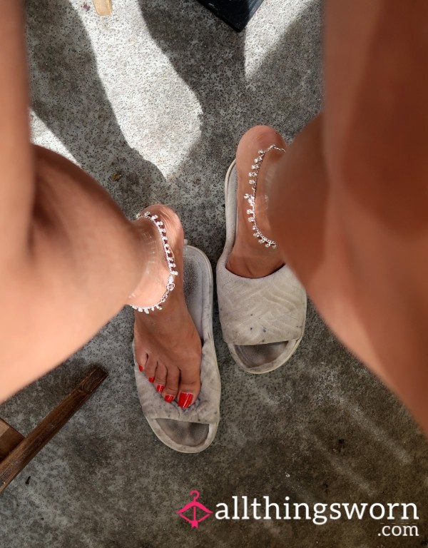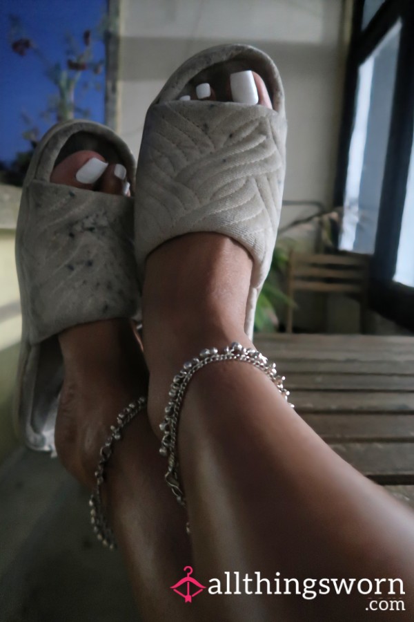 Cute fluffy grey slippers that have been well worn and are now looking for a new owner...