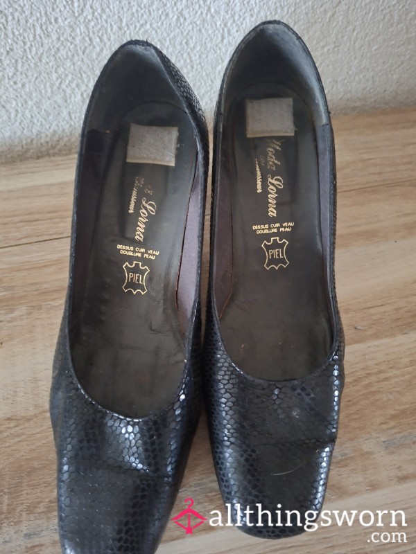 My well worn uniform hotel shoes with leather, they have a shimmer/print on the shoe🥰